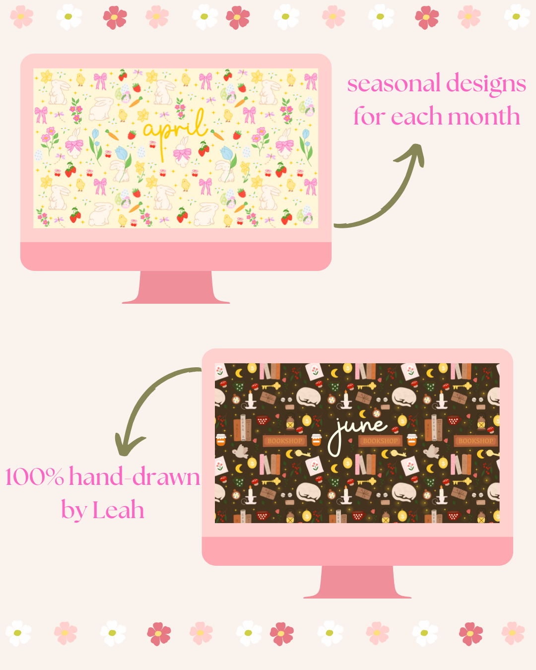 Perfect for adding a little joy to your workspace, this 2025 Desktop Wallpapers Bundle features 12 unique designs. One for each month of the year. Each wallpaper is seasonal, whimsical, and 100% hand-drawn by me, designed to bring cosy, happy vibes to your screen all year long.